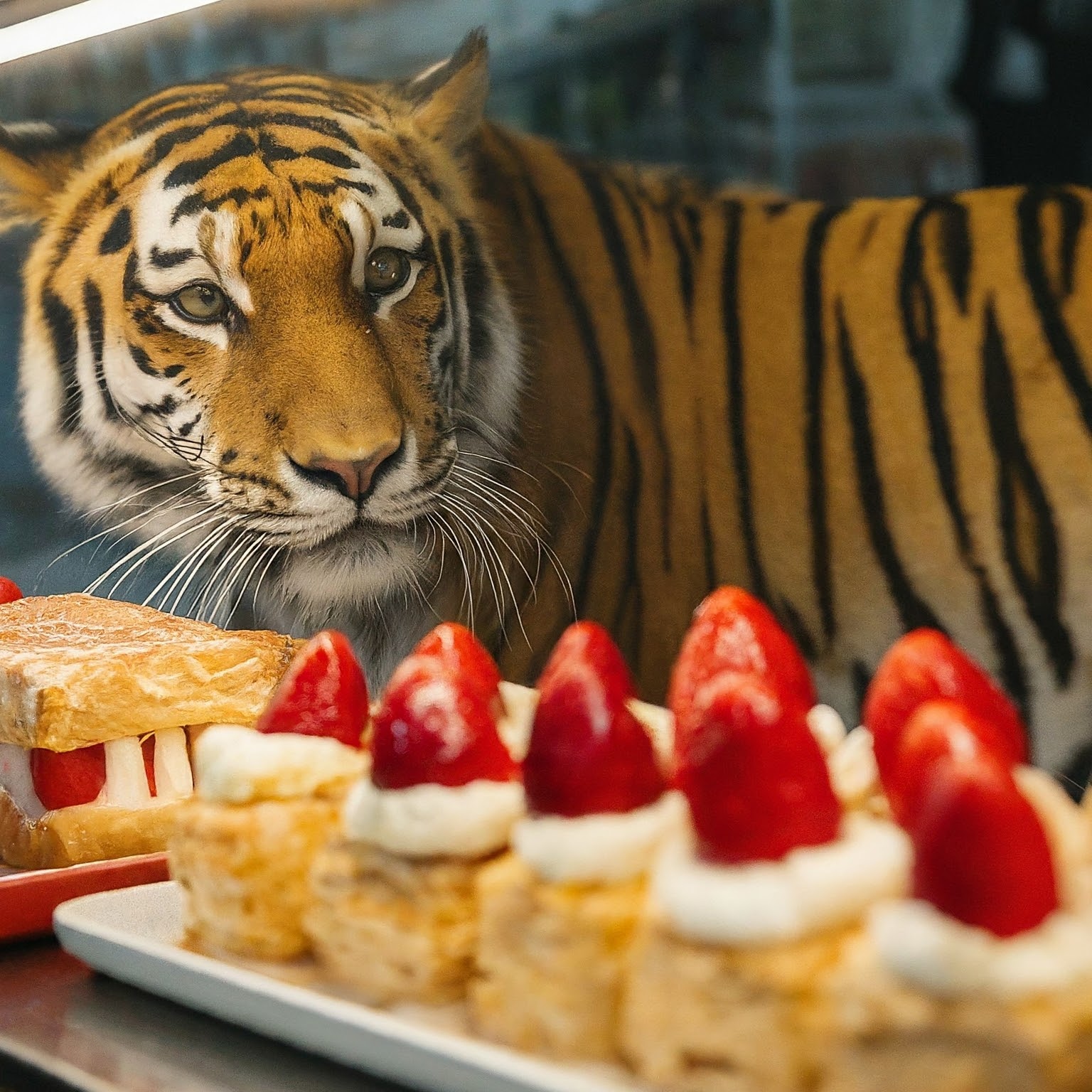 Photo of a tiger peeking at a strawberry shortcake in the showcase at a trendy cake shop.