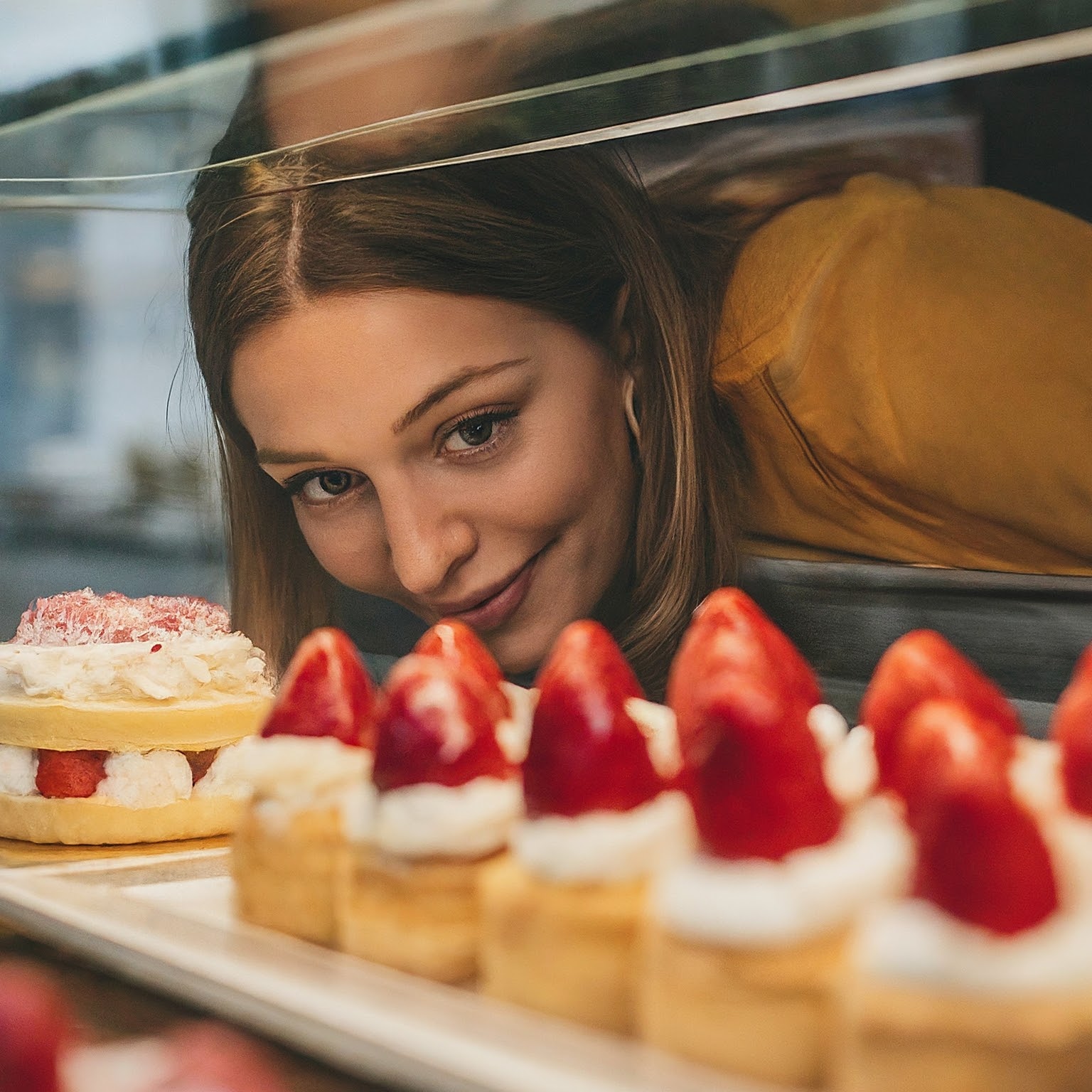 入力したプロンプト:Photo of a young woman peeking at a strawberry shortcake in the showcase at a trendy cake shop.(おしゃれなケーキ屋さんのショーケースでイチゴのショートケーキを覗き込む若い女性の写真。)