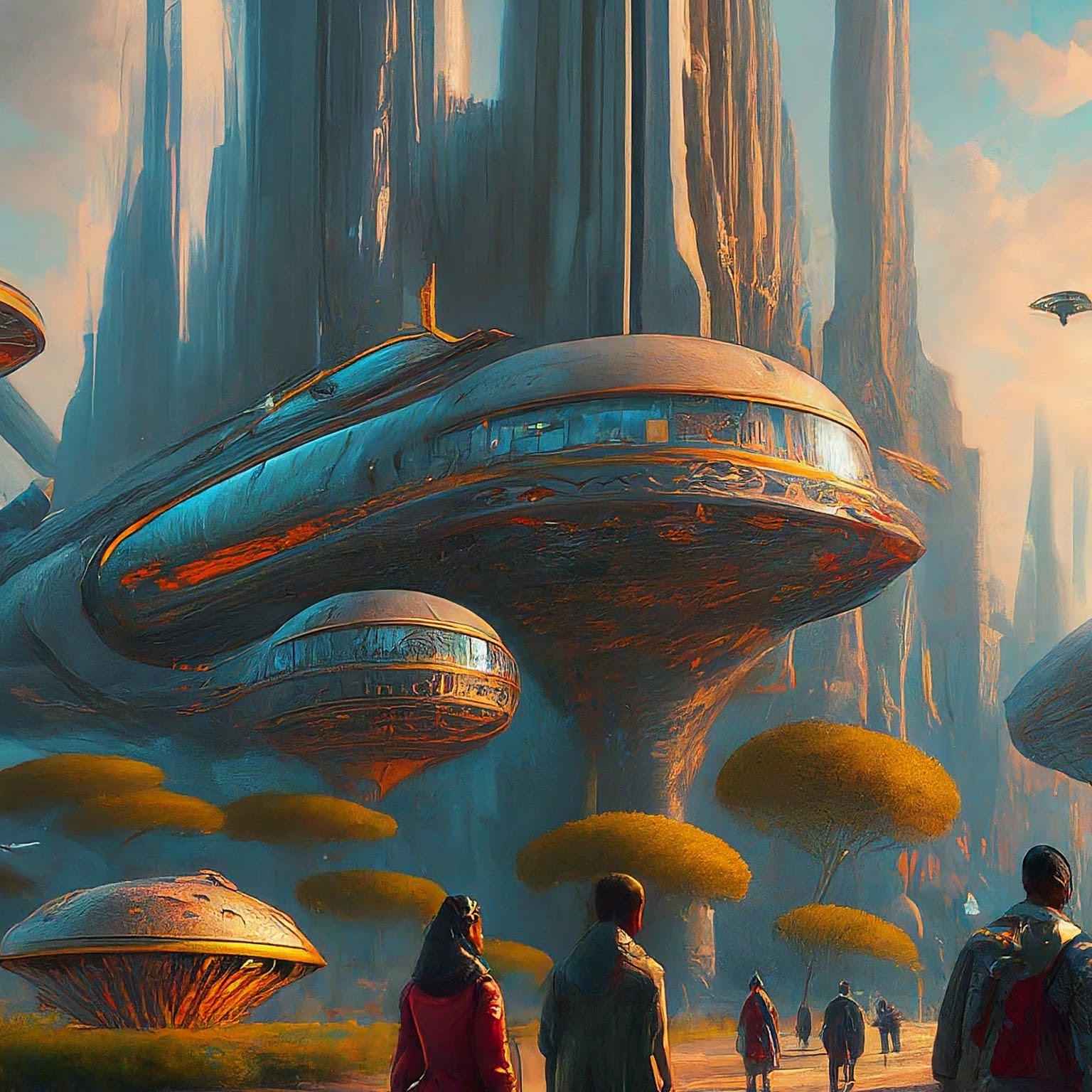 入力したプロンプト:Pictures of humans wandering through a futuristic city.(未来都市の中を彷徨う人間達の写真)