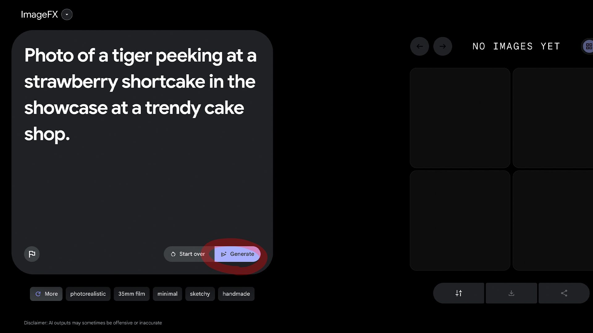 ImageFXはまだ日本語のプロンプトには対応していませんので、英語で入力する必要があります。